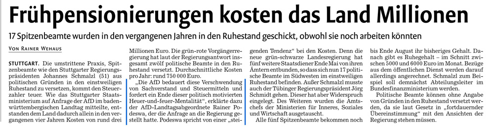 Eine kleine Anfrage von unserem Landtagsabgeordneten Dr. Rainer Podeswa an die Landesregierung ergab, dass allein durch Frühpensionierungen Millionen an Steuern verschwendet werden. 17 Spitzenbeamte haben die baden-württembergischen Regierungen in den vergangenen Jahren aus politischen Gründen in den Ruhestand geschickt. Allein in der vergangenen Legislaturperiode kostete das den Steuerzahler rund drei Millionen Euro.