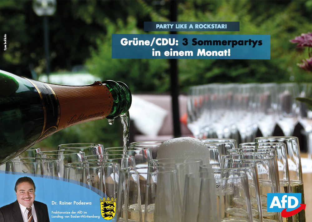 Dementsprechend fällt die Kritik der AfD nun aus. „Drei Sommerpartys in nur einem Monat auf Kosten des Steuerzahlers? Das kann und darf nicht die Normalität sein.“, findet Dr. Rainer Podeswa. „Wenn CDU und Grüne eine extra Regierungsparty feiern wollen, dann sollen sie diese doch gefälligst selbst bezahlen, statt die Steuergelder des Staatsministeriums dafür zu verwenden! Genauso wie Herr Kretschmann seine Geburtstagsfeier hätte selbst bezahlen sollen…“