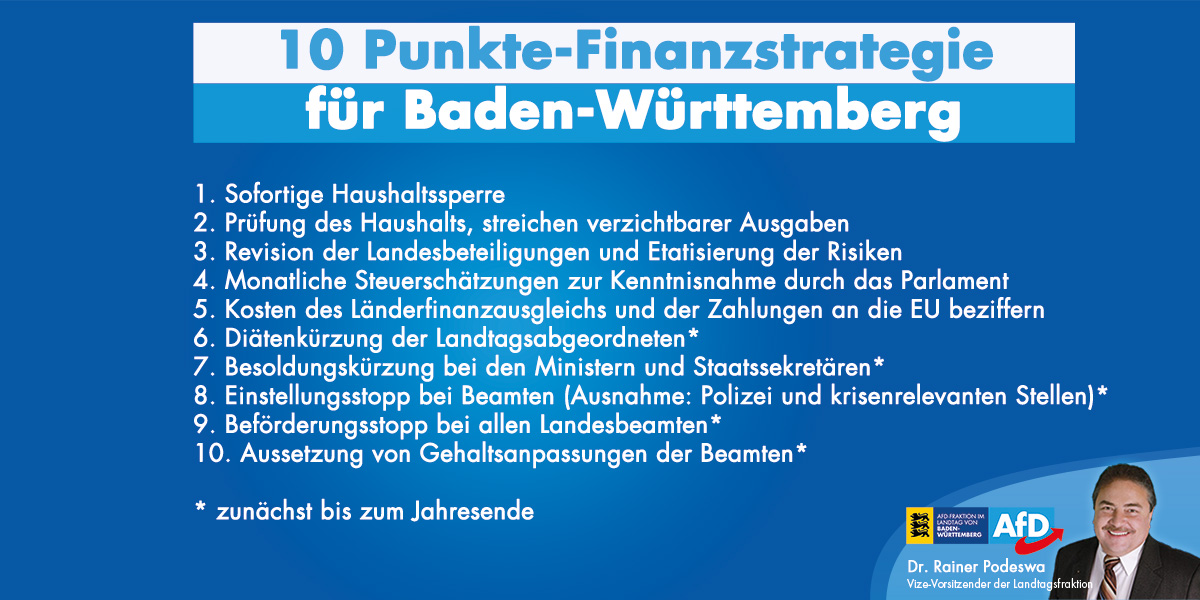 Die AfD-Landtagsfraktion hat heute eine 10-Punkte-Finanzstrategie zur Bewältigung der haushalterischen Folgen der Corona-Pandemie in Baden-Württemberg vorgestellt.