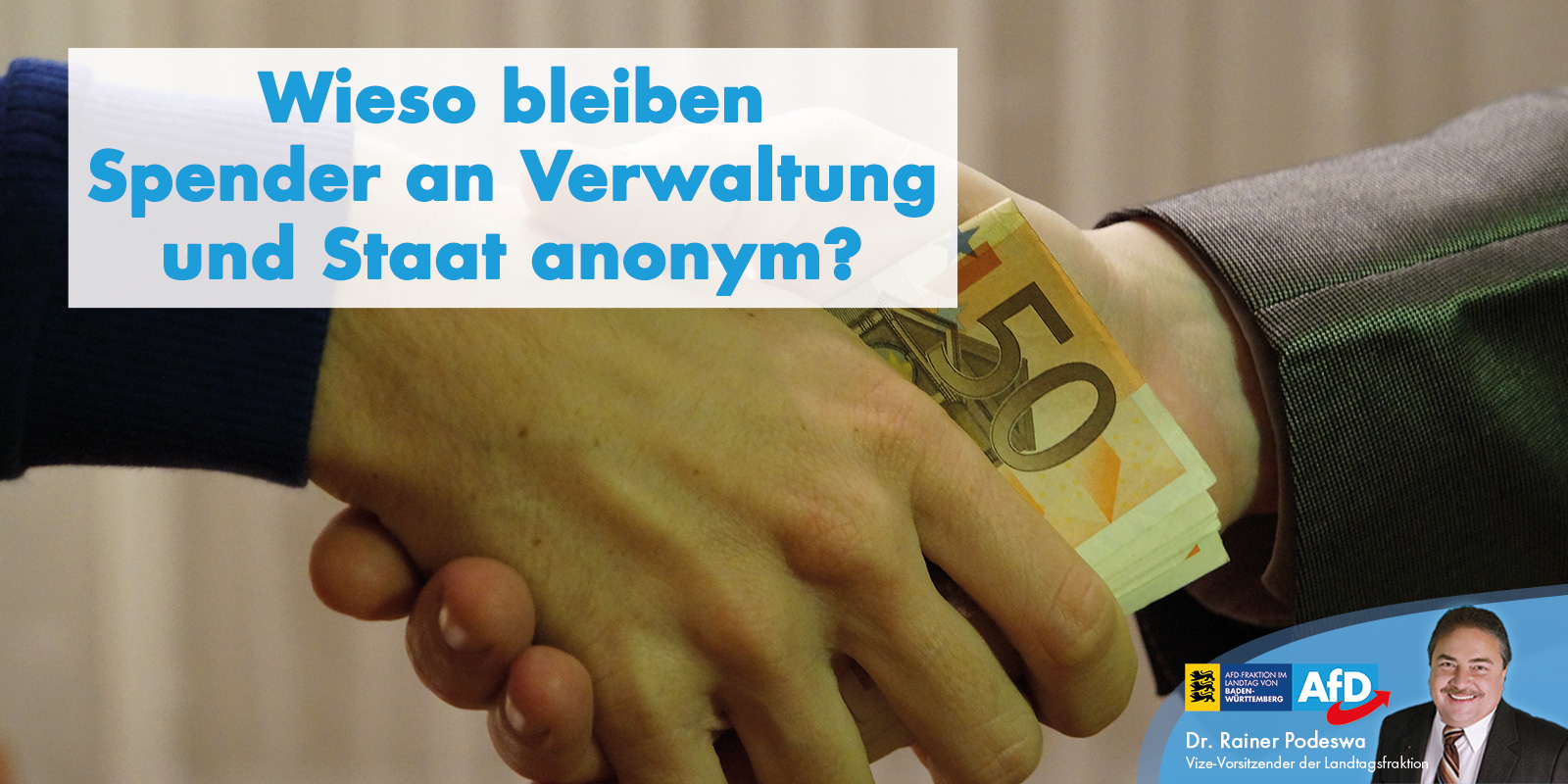 „Die Landesregierung versucht also angeblich Korruption zu bekämpfen, aber der Datenschutz lässt das nicht zu. Das soll doch wohl ein Witz sein?“, meint der Abgeordnete. Er kritisiert, dass es möglich ist, der Polizei, Regierungspräsidien, Bauämtern, Universitätskliniken usw. Spenden zukommen zu lassen, bei denen der Spender nicht veröffentlicht wird – unabhängig von der Höhe der Spende. „Wie soll man darauf vertrauen, dass nicht ein Unternehmen einem Bauamt oder ein reicher Erkrankter einer Klinik einen bedeutenden Betrag spendet und im Gegenzug auf eine bevorzugte Behandlung hofft? Wohlgemerkt sind die Spenden nicht anonym – denn wären sie nicht zuordenbar, dann wäre auch kein Vorteil zu erwarten. Die Spender sind bekannt, aber eben nur dem Empfänger und nicht der Öffentlichkeit“, so Podeswa.