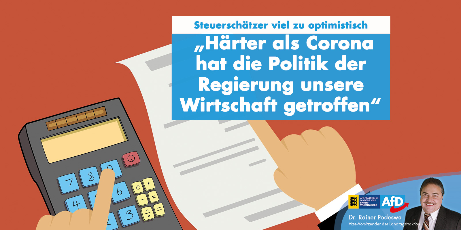 Härter als Corona habe nämlich die Politik der Landesregierung unsere Wirtschaft getroffen, so Podeswa. „Der ideologisch begründete Kampf der Landesregierung gegen die Baden-Württembergischen Schlüsselindustrien Automobilindustrie und Maschinenbau und ihr Dschungel aus Corona-Regelungen und Maskenpflicht geben unserm Land den Rest. Die Landesregierung freut sich aktuell noch über die nachgelagert fließenden Steuereinnahmen aus wirtschaftlich guten Zeiten. Die Landesregierung soll endlich ihre Ausgaben auf dringende benötigte Hilfen reduzieren“, so der Fraktionsvize. „Als AfD-Fraktion haben wir bereits im Frühjahr von der Landesregierung gefordert, einen Kassensturz und eine Steuerschätzung vorzunehmen. Dem ist die Landesregierung deutlich zu spät nachgekommen. Die nächsten Steuerschätzungen werden uns weiter erodierte Steuereinnahmen aufzeigen.“