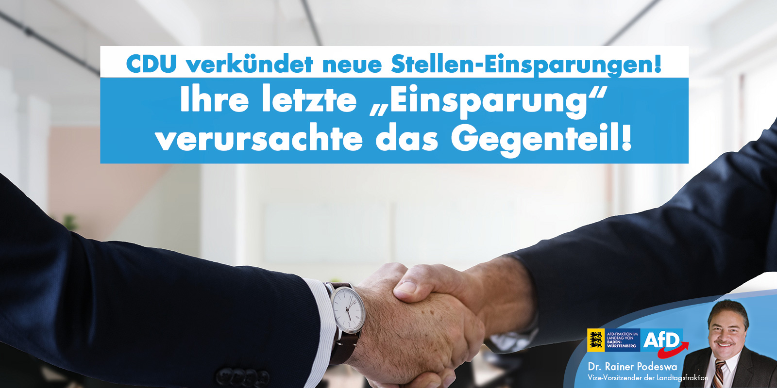„Die grün-schwarze Landesregierung hat in der vergangenen Legislaturperiode tausende Stellen aufgebaut, statt wie versprochen abzubauen. Der Bürger und die Opposition lassen sich von diesem erneuten Versprechen keinen Sand in die Augen streuen. Ich hätte nicht gedacht, das sich der CDU-Verhandlungsführer Strobl noch unglaubwürdiger machen könnte“, so Dr. Podeswa weiter.