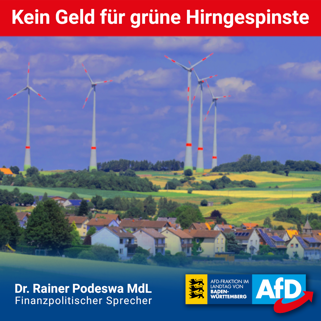 Podeswa verweist darauf, dass sich die neue Regierung schon ohne die Steuerschätzung an den Bürgern versündigte. „Ein zusätzliches Ministerium, die Verdopplung des IT-Budgets, neben der Unzahl an Staatssekretären ein neuer Parlamentsvize – das war unverfroren, zumal erst CDU-Generalsekretär Manuel Hagel ‚mehr Leidenschaft bei der Frage, wo wir sparen können‘ anmahnte und heute Vizeregierungschef Thomas Strobl mit den Worten ‚Da wird Schmalhans Küchenmeister sein‘ nachzog. Ich warne davor, in dieser Situation Hirngespinste wie die ‚Green Tech Allianz‘ oder gar das Sofortprogramm für den Bau von bis zu 1000 neuen Windkraftanlagen zu realisieren. Das Land und seine Wirtschaft müssen vorankommen, nicht das Klima.“