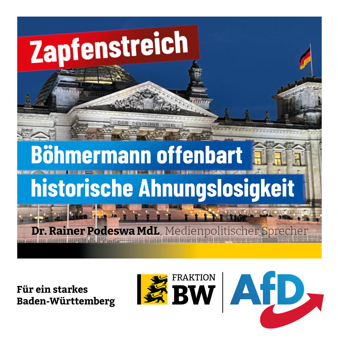 Der medienpolitische AfD-Fraktionssprecher Dr. Rainer Podeswa hat dem ZDF-Satiriker Jan Böhmermann Geschichtsvergessenheit vorgeworfen. „Eigentlich sollte man den Gedankenschrott gebührenfinanzierter Comedians gepflegt ignorieren. Aber wer die Bundeswehr mit der Wehrmacht gleichsetzt und den Ursprung der Tradition des Zapfenstreichs im Dritten Reich verortet, offenbart eine so abgrundtiefe historische Ahnungslosigkeit, dass man sich sorgen muss, wie es um das Bildungsniveau öffentlich-rechtlicher Mitarbeiter insgesamt bestellt ist. Zu behaupten, dass ‚Fackelmärsche von Uniformierten vorm Reichstag‘ die ‚ganze Welt retraumatisieren‘, ist schlimmster politischer Missbrauch zehntausender Soldaten, die am Hindukusch Ausdauer und Augenmaß bewiesen, Brunnen gebaut, Schulen errichtet – und ja, auch gekämpft haben: 59 Soldaten kehrten nicht nach Hause zurück. Aber in einem sozialen und medialen Klima, dass Männlichkeit per se als ‚toxisch‘ verunglimpft und einer umfassenden Pazifizierung des Landes das Wort redet, kann man offenbar nicht mehr anders als jede Form des Militärischen abzulehnen und das für jede Armee notwendige Prinzip von Hierarchie sowie Befehl und Gehorsam als dem dominierenden linken Selbstverständnis in Erziehung und Werteordnung widersprechend zu verurteilen.“