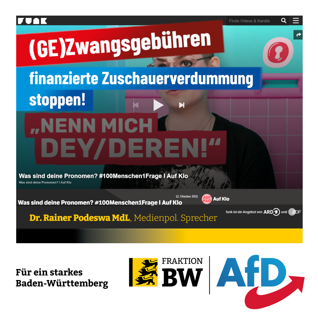 Der medienpolitische AfD-Fraktionssprecher Dr. Rainer Podeswa hat den SWR-Intendanten Kai Gniffke aufgefordert, die Verbreitung unwissenschaftlicher Ideologie auf den von ihm verantworteten funk-Jugendkanälen zu stoppen. „In der jüngsten Folge des schon grenzwertig benannten Formats Auf Klo stehen Personalpronomen auf dem Programm. ‚Jede:r macht Fehler‘, wird das ‚komplizierte‘ Thema begründet. Mit einem sensiblen Sprachumgang könne man gemeinsam einen sicheren Raum für alle schaffen ‚und niemanden zu misgendern‘. Prompt wird für subjektive ‚Neopronomen‘ wie xier oder dey geworben: Frauen, Männer, nichtbinäre Menschen und alle anderen dürften Neopronomen für sich nutzen, wenn sie möchten. Das konterkariert jeden Deutschunterricht und jede Hochschulbildung und ist sprachwissenschaftlich schlicht absurd.“