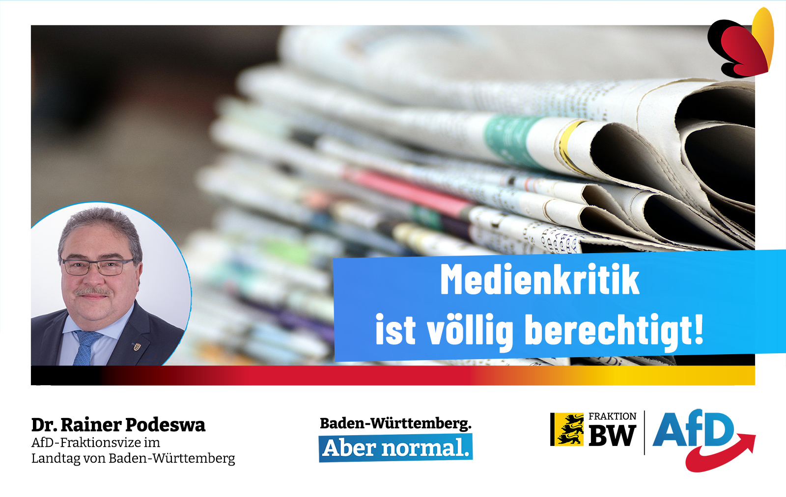 Es stellt sich gar nicht primär die Frage, ob es Zeitungen finanziell so schlecht geht, dass sie auf Anzeigen von Ministerien und anderen Institutionen angewiesen sind, befindet Podeswa. „Es geht auch nicht um die wissenschaftlichen Tatsachen der Zweigeschlechtlichkeit, zu denen mein Kollege Dr. Balzer gestern schon anmerkte. Es geht schlicht und ergreifend darum, dass der Prozess weg von publizistischer Vielfalt hin zu publizistischer Einfalt der ideologischen Oberflächlichkeit Tür und Tor öffnet und demokratieschädlich ist. Ich erinnere an die Allensbach-Umfrage, wonach nur noch 45 Prozent der Bürger die Meinungsfreiheit gewährleistet sehen. Und ich erinnere an die teilweise beschämenden Vorgänge um Publizisten wie Harald Martenstein, Jan Fleischhauer oder Ulf Poschardt, die von einer ‚politischen Flurbereinigung‘ sprechen. Ausbleibende demokratische Willensbildung treibt aber die Polarisierung voran. Das kann nicht Aufgabe unserer Medien sein.“